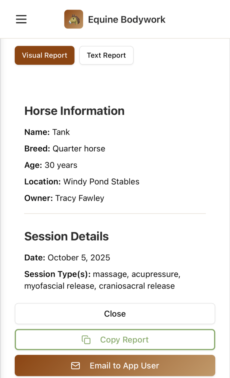 Equine Bodywork Assistant is a professional and intuitive application designed for equine bodywork practitioners. Seamlessly manage your horse clients, document detailed bodywork sessions, track progress, and generate professional reports. Equine Bodywork Assistant is a web based app. Save to home screen and log in from any of your devices.
