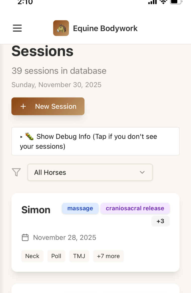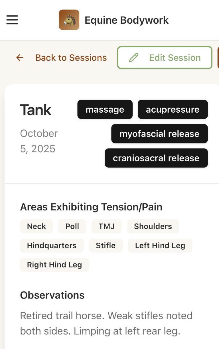 Equine Bodywork Assistant is a professional and intuitive application designed for equine bodywork practitioners. Seamlessly manage your horse clients, document detailed bodywork sessions, track progress, and generate professional reports. Equine Bodywork Assistant is a web based app. Save to home screen and log in from any of your devices.